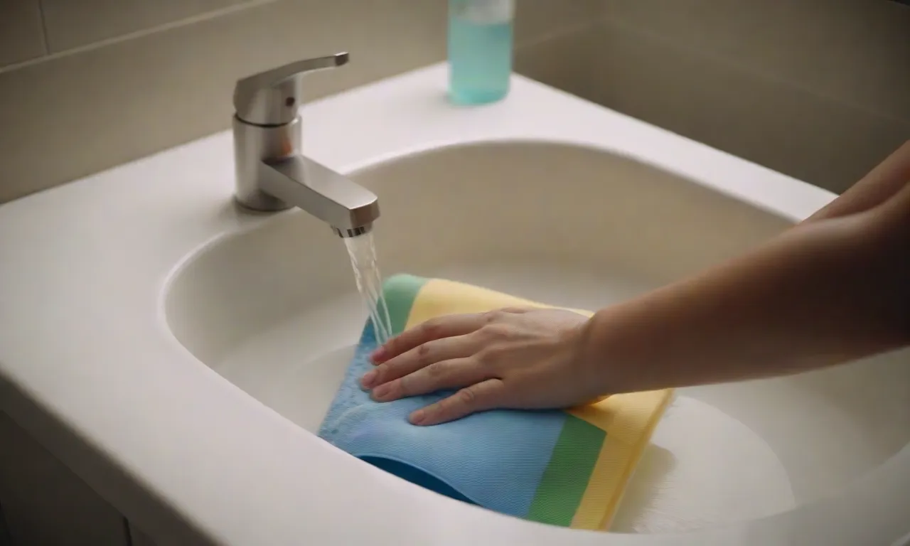 - Fill your basin or tub with cool or lukewarm water – never hot! (Hot water can damage polyester fibers)